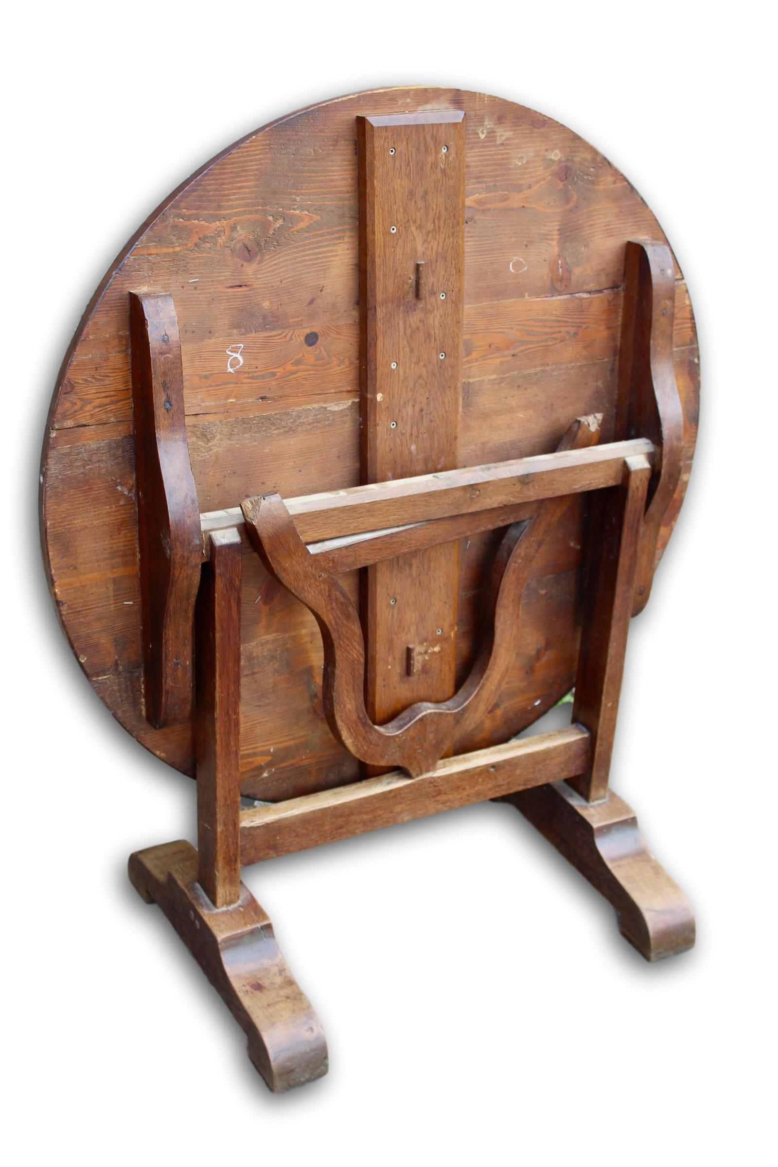 A lovely French 19th C (1880) Vendange table in good overall condition. These tables were used in French farms and vineyards to serve food and drinks to workers. They are robustly made and fold flat for ease of storage. This table has some modern screws securing the top to the base otherwise it is in good original condition.
