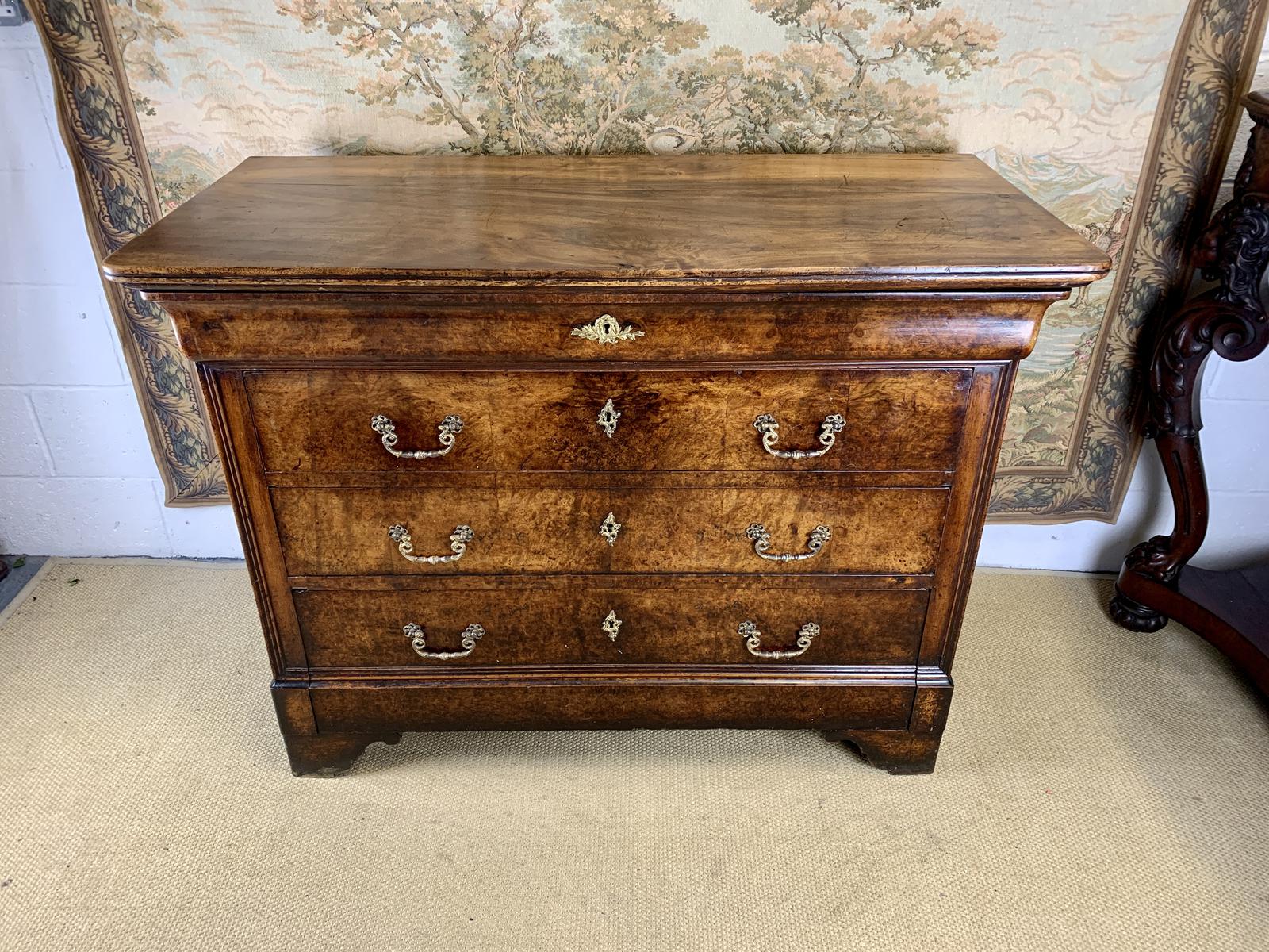 A stunning French 19th Century antique burr walnut commode with a walnut top and four drawers. In good original condition and a wonderful warm colour.