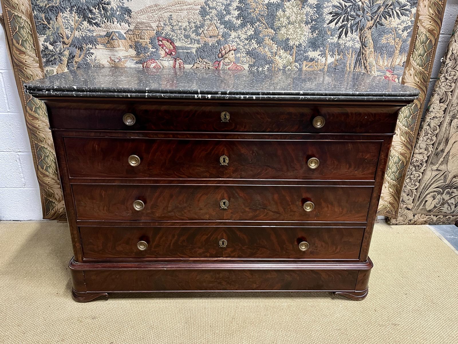 This is a fabulous mid 19th Century French antique commode made from fine quality mahogany timbers with brass handles and a grey marble top. It has five drawers. It dates around 1850.