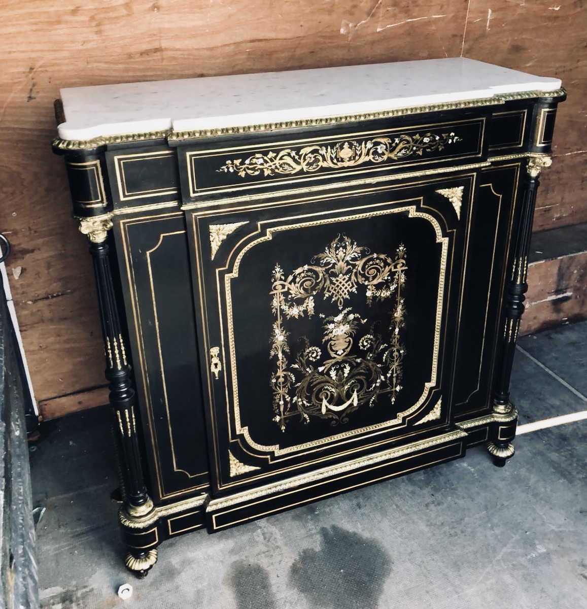 Fine example of a ormolu mounted French cabinet with marble top possibly made by Mathieu Befort.The centre panel is truly exquisite with inlaid mother of pearl, ivory and brass.