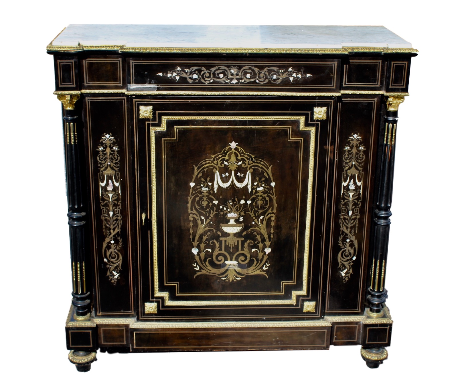 An absolutely stunning French ormolu mounted antique cabinet made around 1800 with beautiful inlaid brass and mother of pearl decoration.