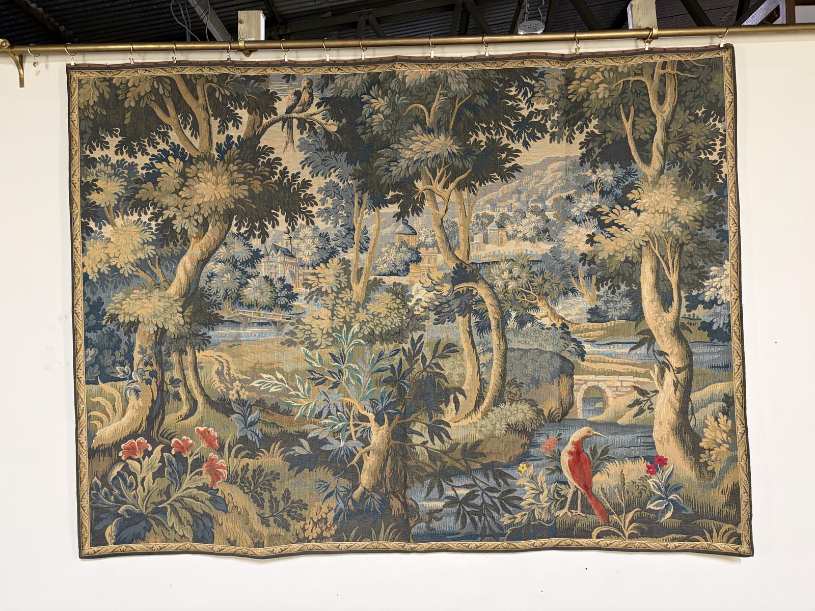 A very good quality French 20th century tapestry wall hanging with red flowers and birds in the foreground. In good overall condition and on a good scale.