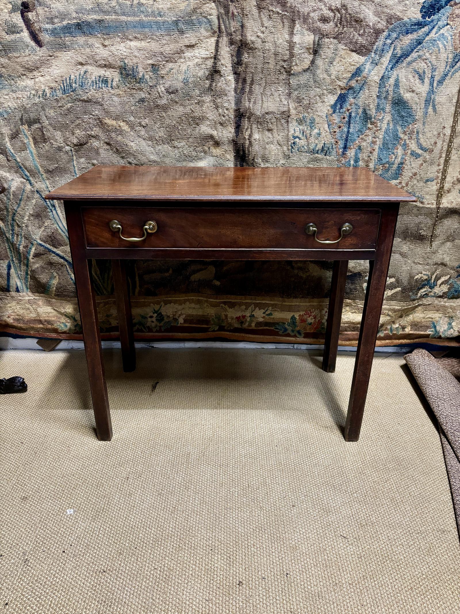 This is a very good quality 18th Century Georgian antique mahogany side table with single drawer to the front and original brass swan neck handles.