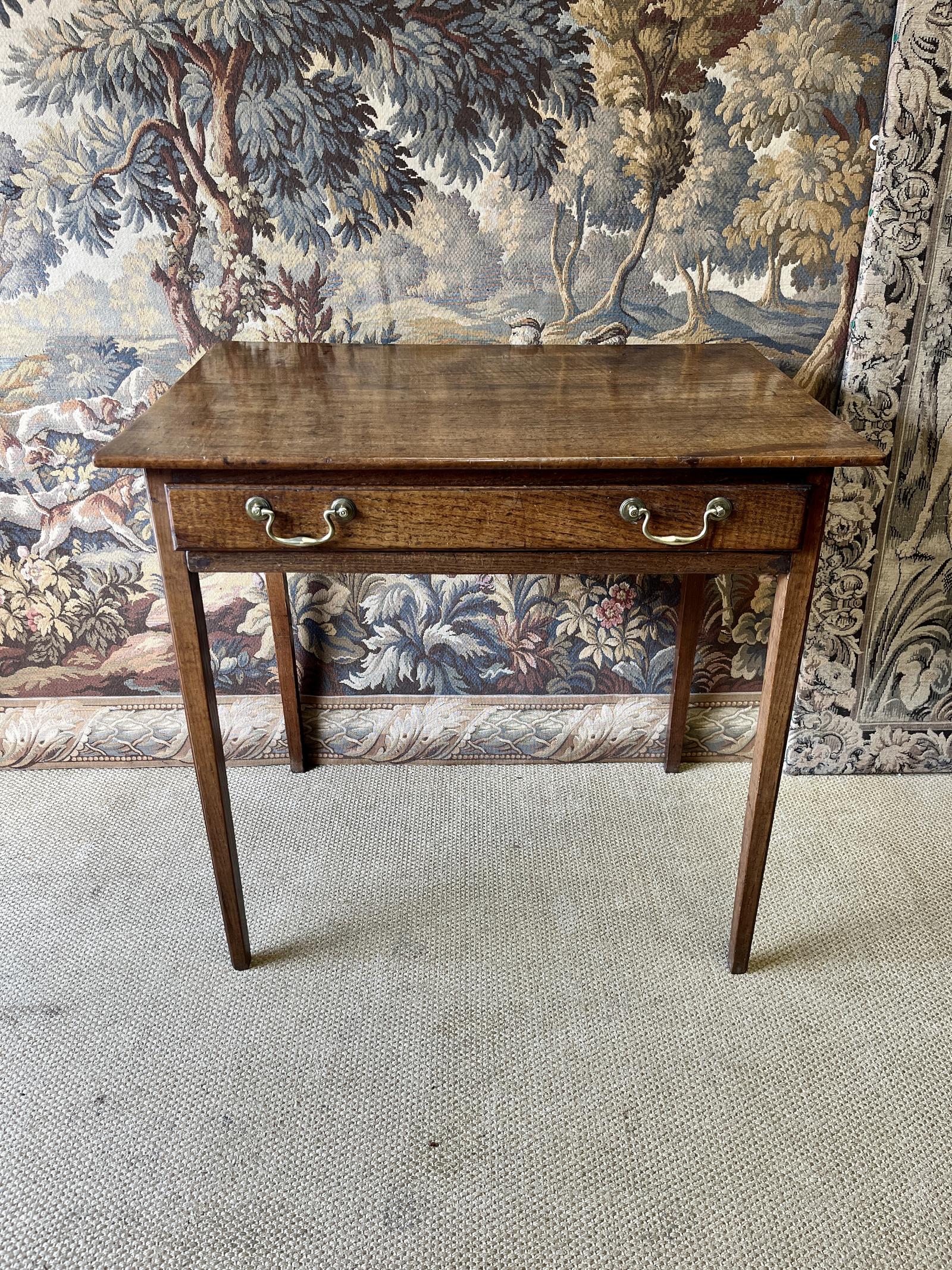 This is a very good quality 18th Century English Georgian (1790) antique side table with full width single drawer and original brass handles.