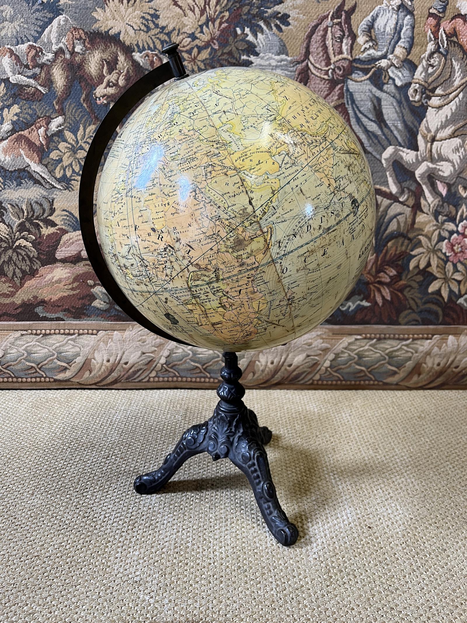 This is a good quality antique globe on cast iron stand dating to around 1900 and in worn condition as shown in photos.