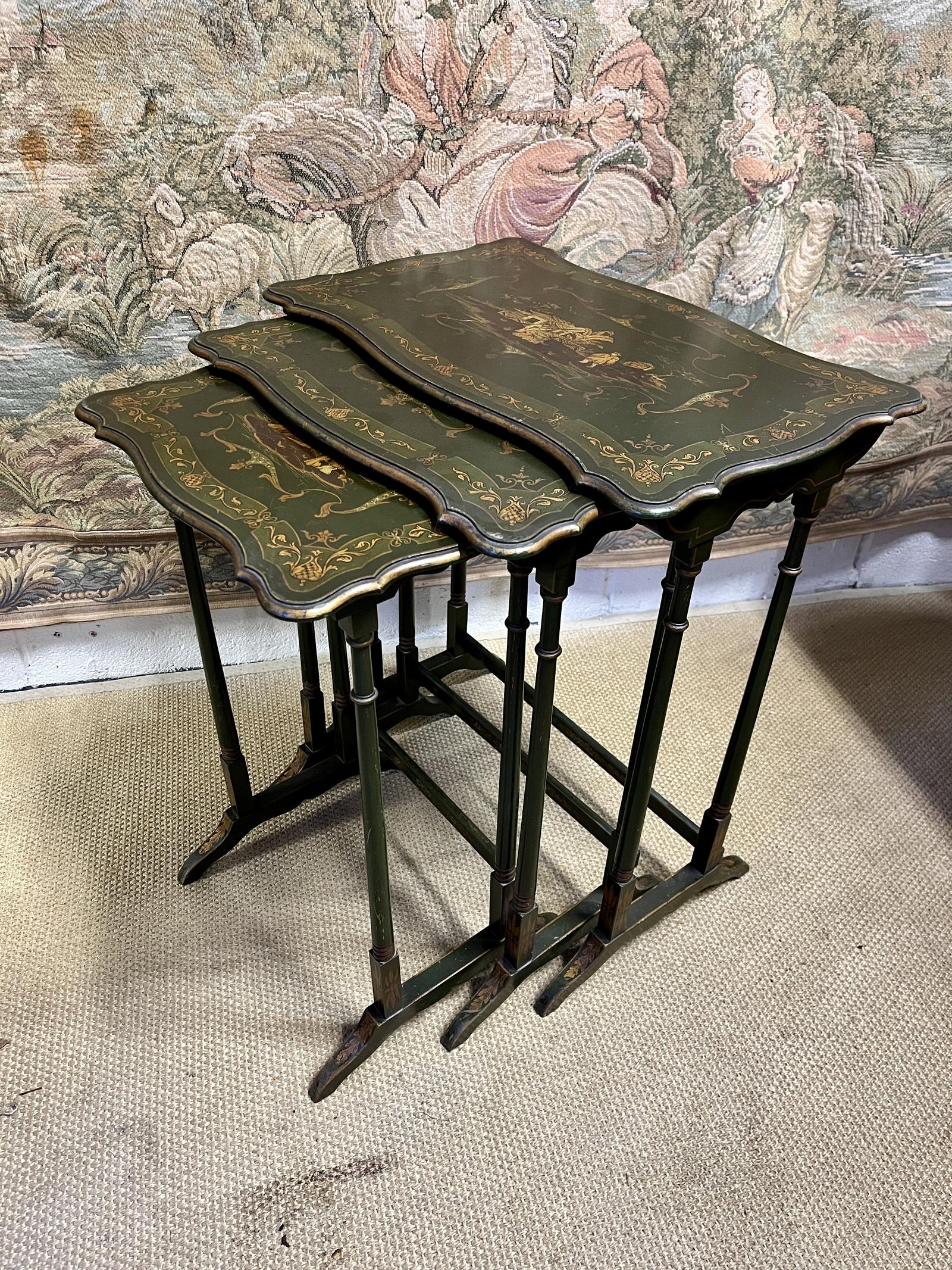 This is a very good quality early 20th Century nest of tables. Painted green with Chinoiserie decoration.