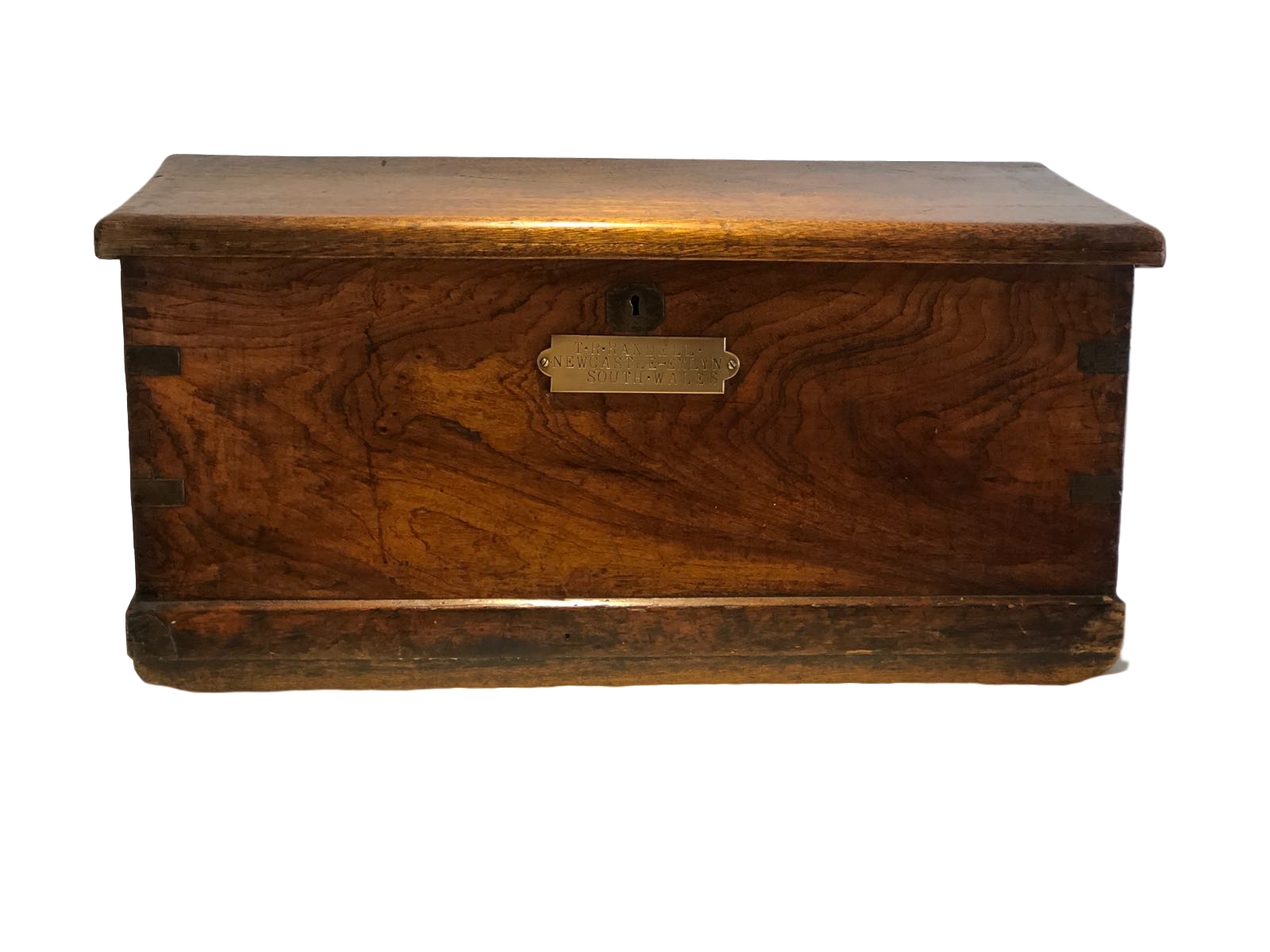 This is an 18th Century antique sea chest / trunk made of elm with a plaque on the front from a former owner and in lovely condition.