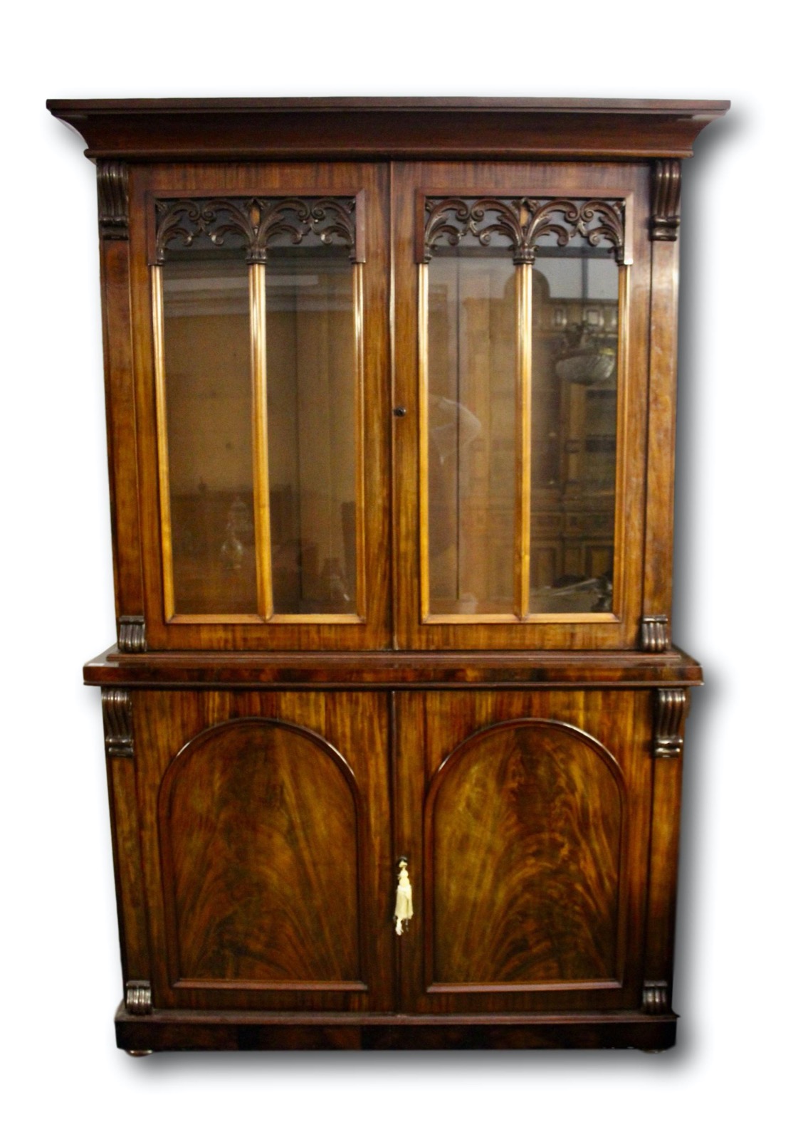 Standing over 8ft high with glazed doors to the front. This bookcase features decoration throughout including intricate carved scrollwork to the glass doors and arched panelling to the base. All made from finest quality mahogany timber.