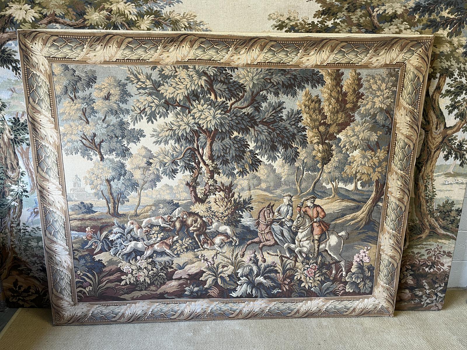 This is a beautiful early 20th Century French antique tapestry. It is brightly coloured showing a hunting scene. It is mounted to a frame.