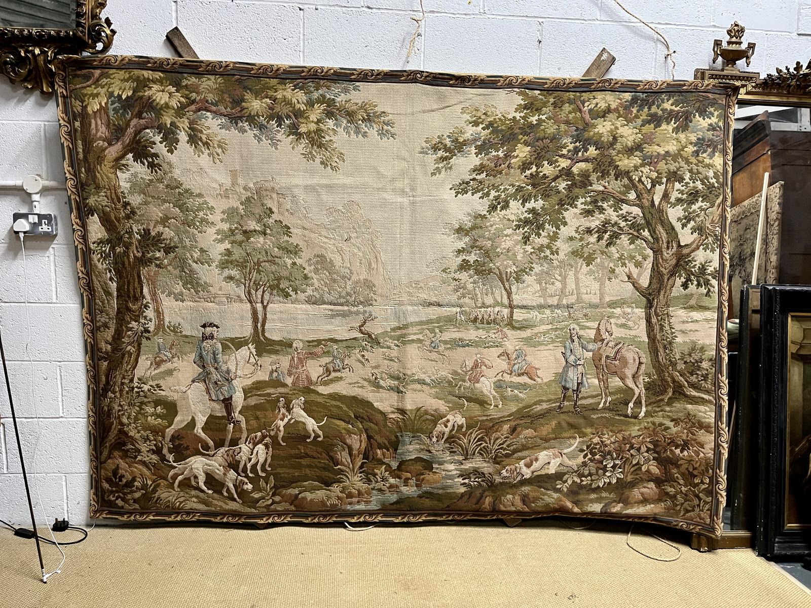 This is a very large, good quality French tapestry showing a hunting scene and in good original condition.