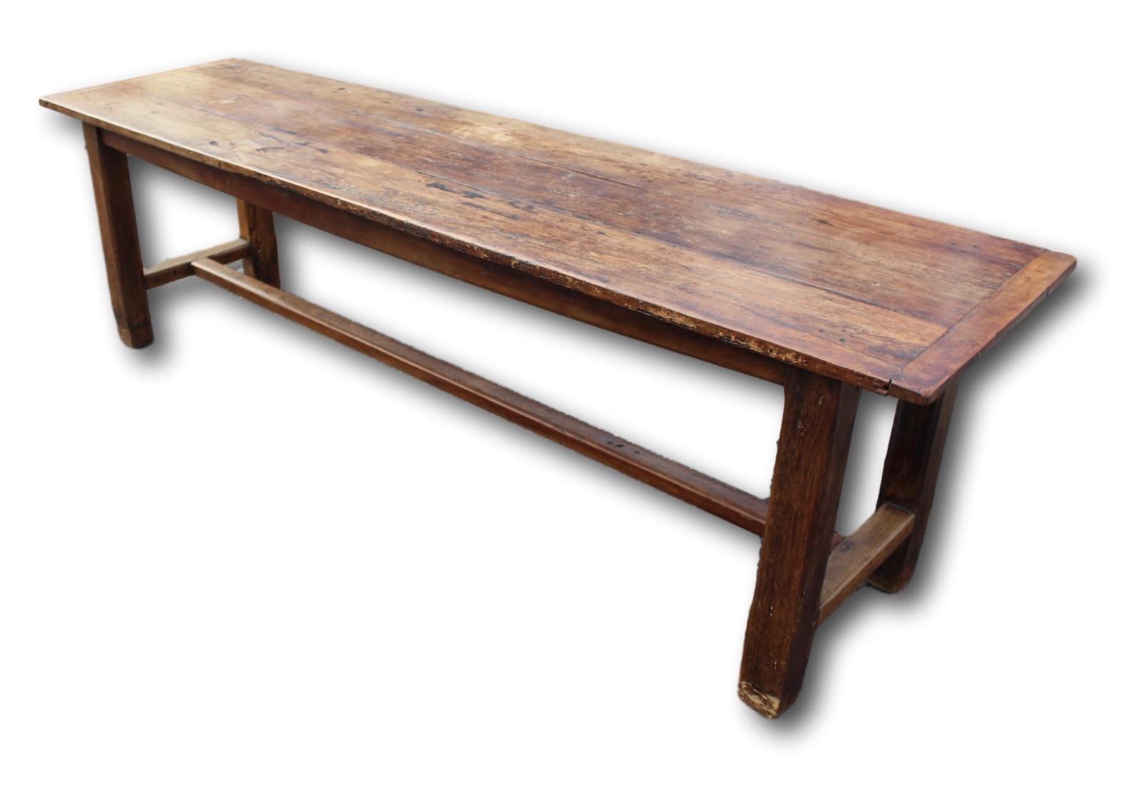 A very attractive, large fruitwood dining table in fabulous country house condition, with three planks to the top and a stretcher running along the middle, this table is a very useable size being over 8 feet in length. This would enable it to sit up to 10 people.
