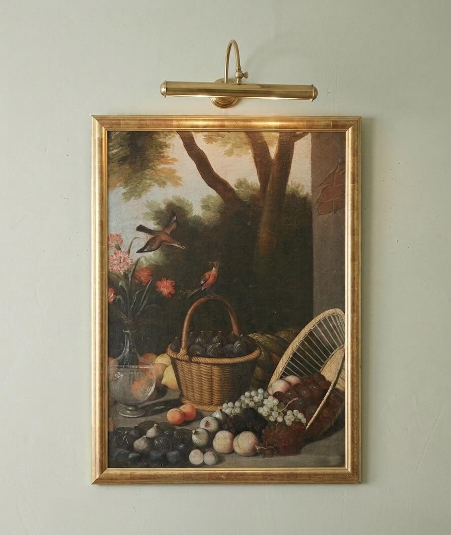 Showing a still life scene with fruit baskets, accompanied by birds.