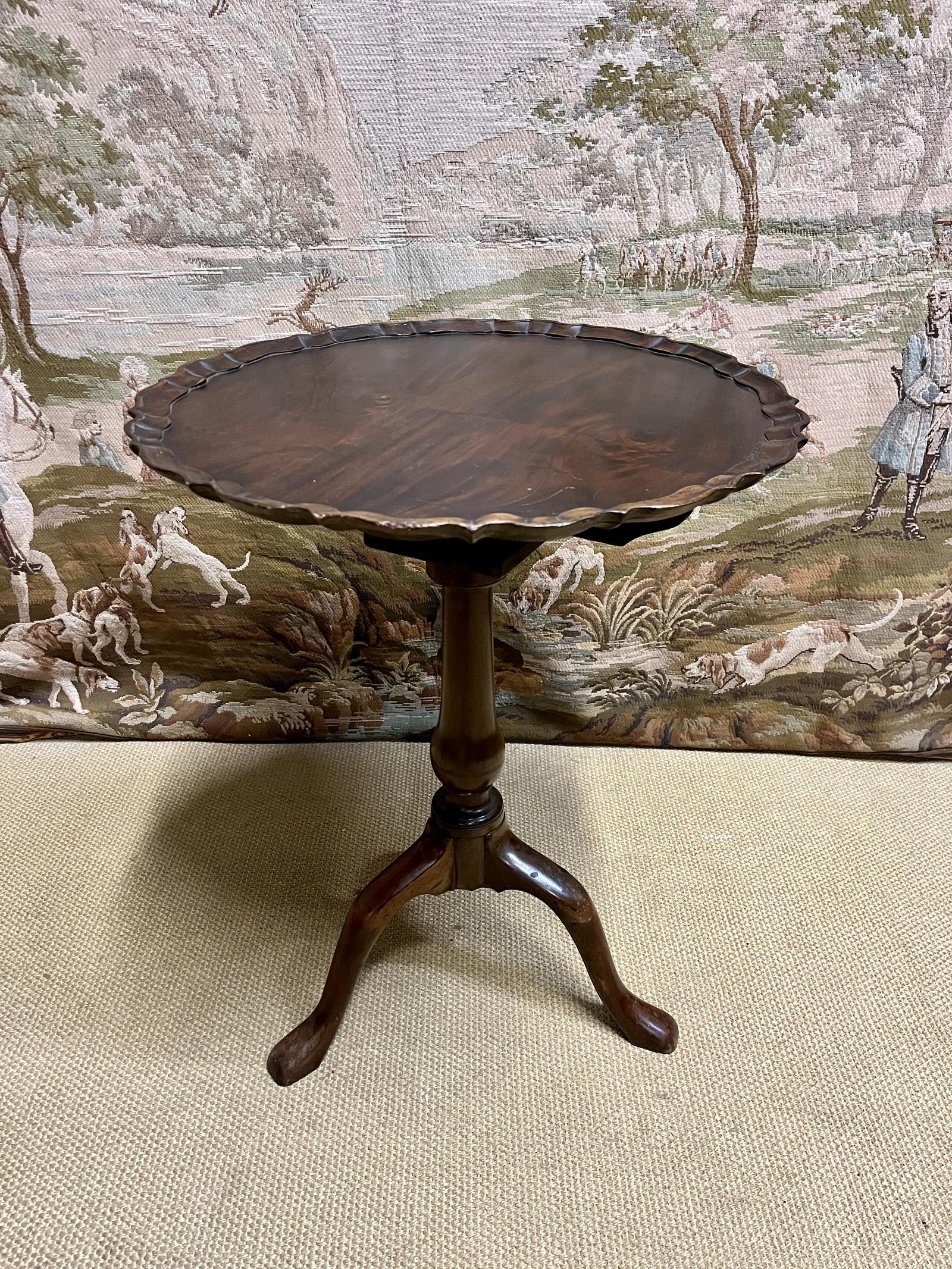 This is a very attractive 19th Century antique mahogany tilt top table with carved top standing on three legs.