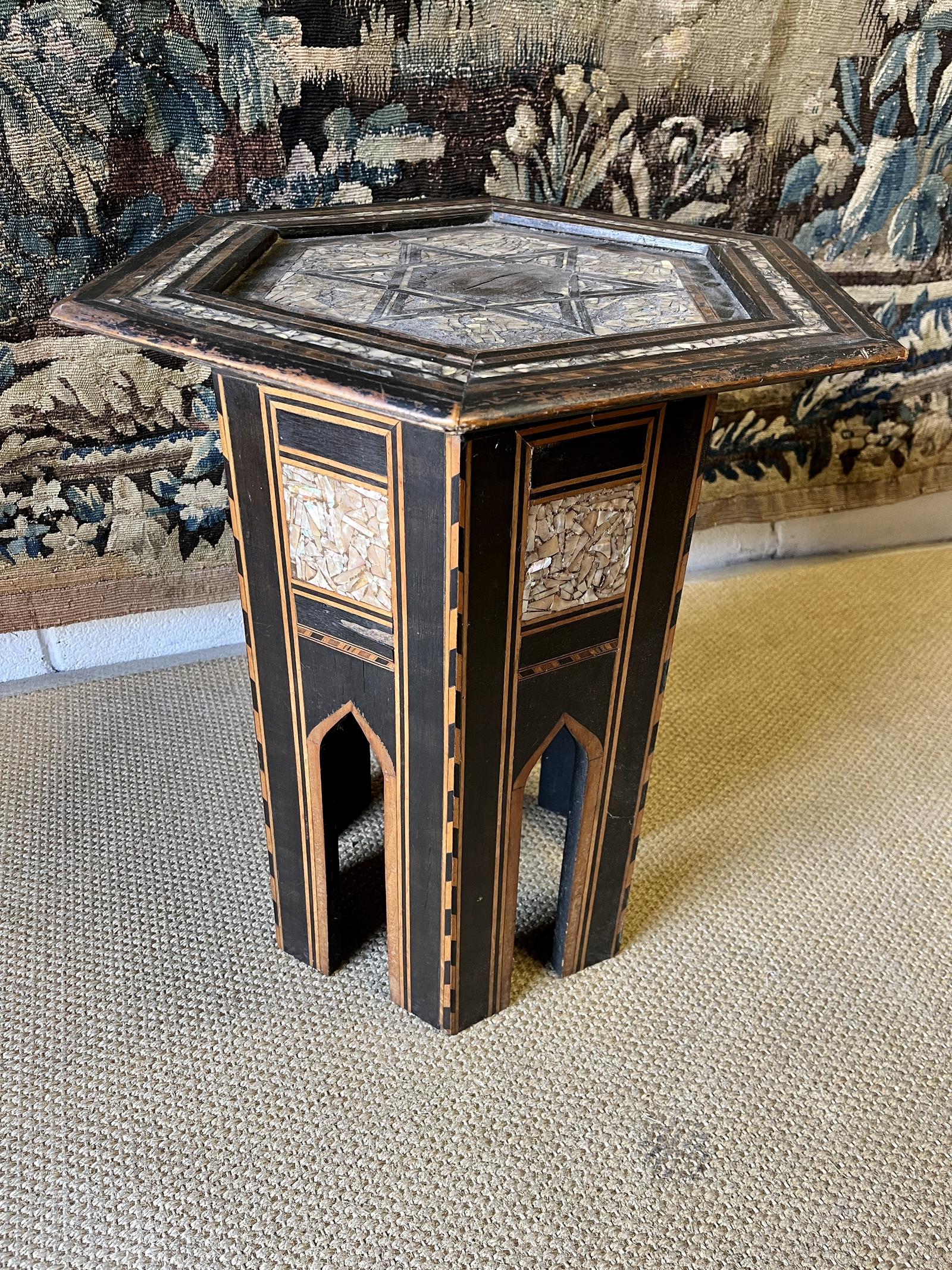 Offered for sale is this late 19th Century Eastern/Islamic antique table with ebony timbers, inlay and mother of pearl decoration. A good large size and very solid. Significant wear to the top as shown in photos.