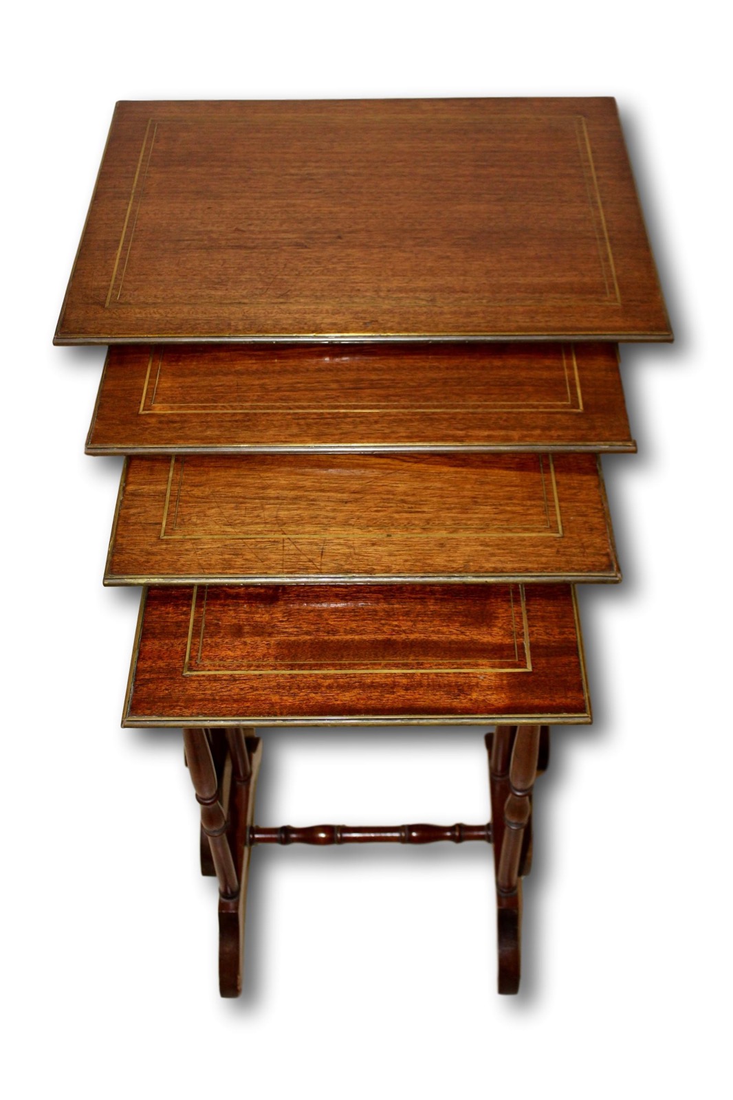 These are a nest of four brass inlaid tables made in England around 1890 in the 'Regency style'. These tables are in good condition with the tops being relatively free of scratches and the structure of the tables being very good.