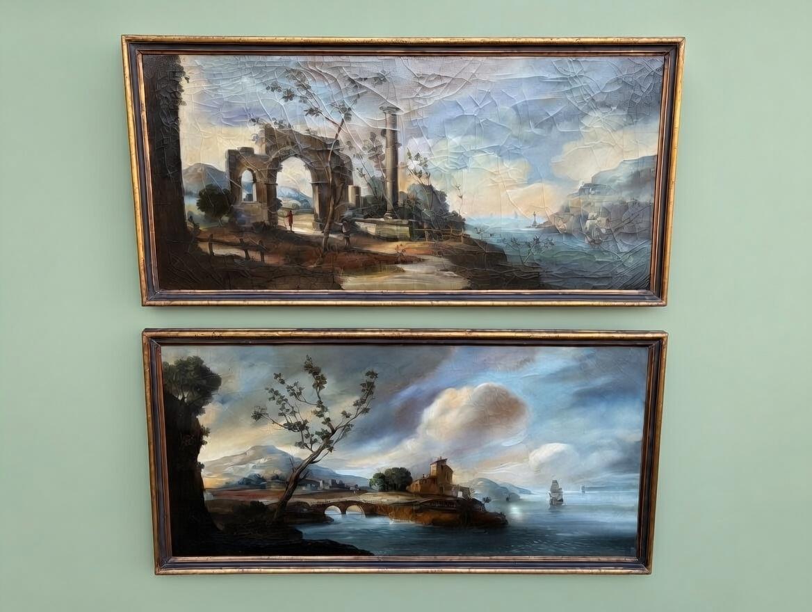 A beautiful pair of Italian oil on canvas riverside scenes.