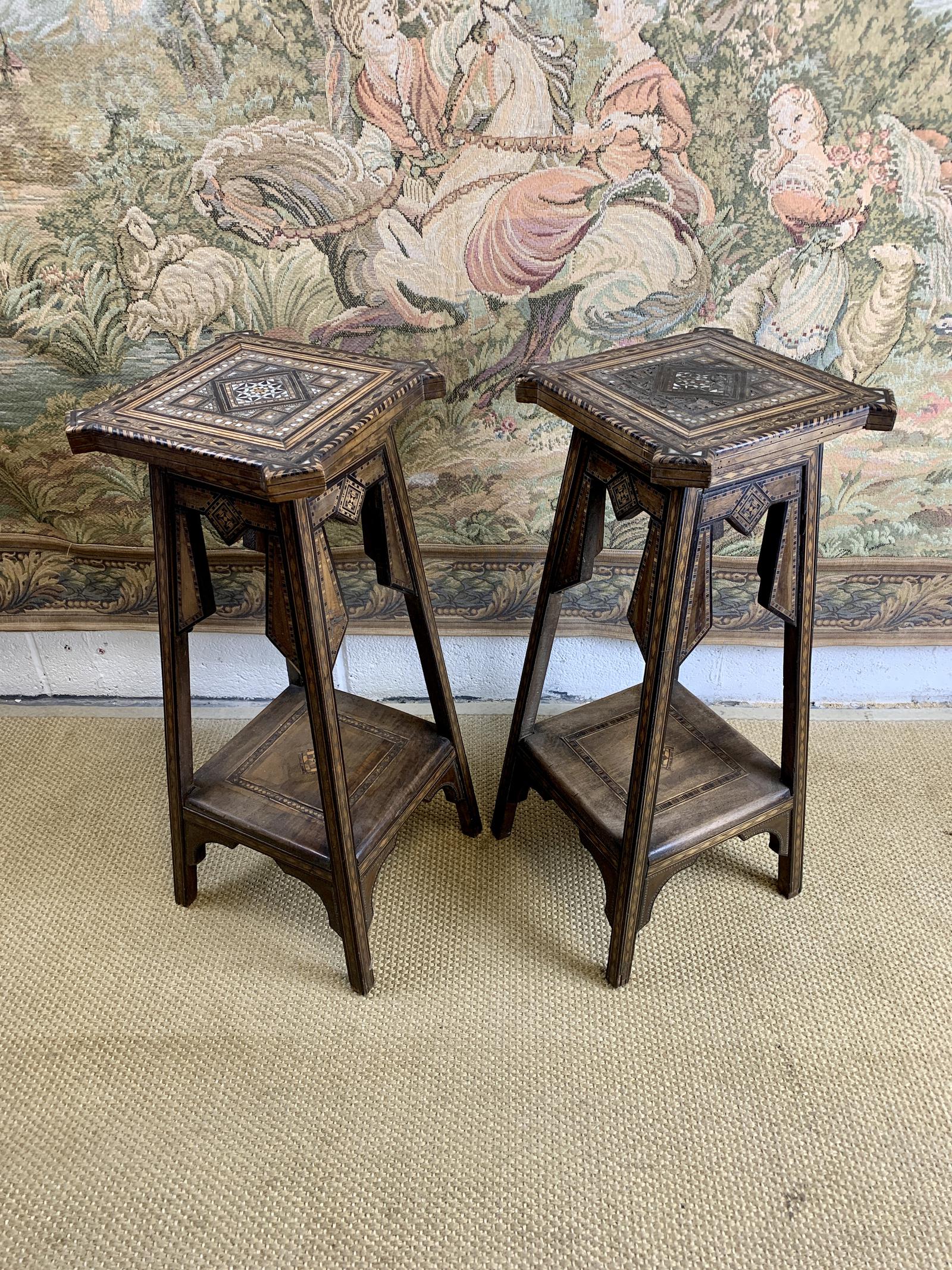 A superb pair of 19th Century antique stands, with mother of pearl and mixed timber inlays throughout. The top of one table is damaged as shown in photos.