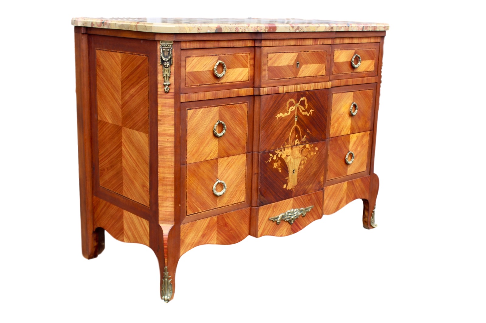 Parquetry Commode with Marquetry Inlay, Ormolu Mounts and Marble Top
