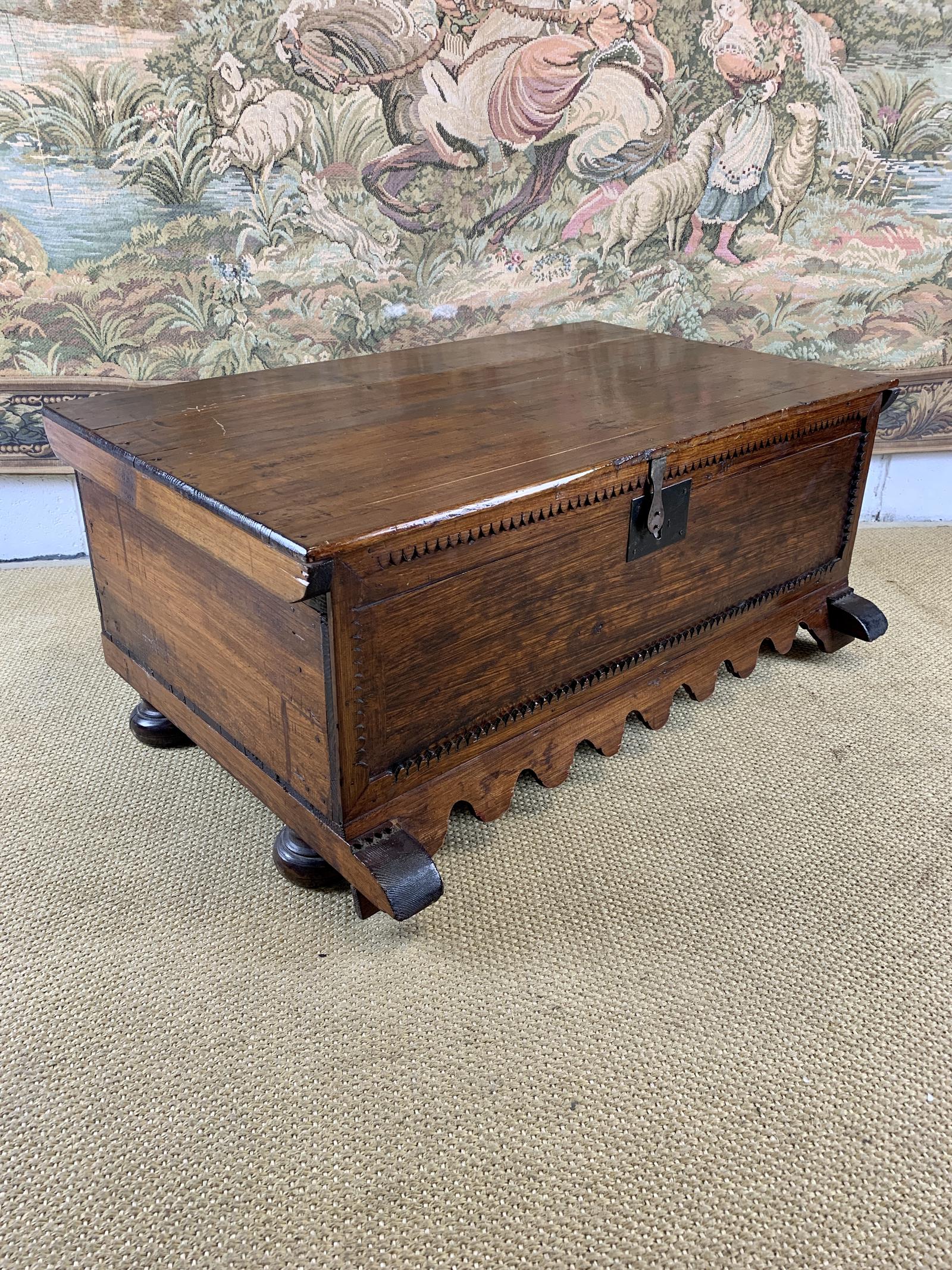 A very attractive Spanish late 19th Century antique provincial coffer made from carved timber and standing on bun feet.