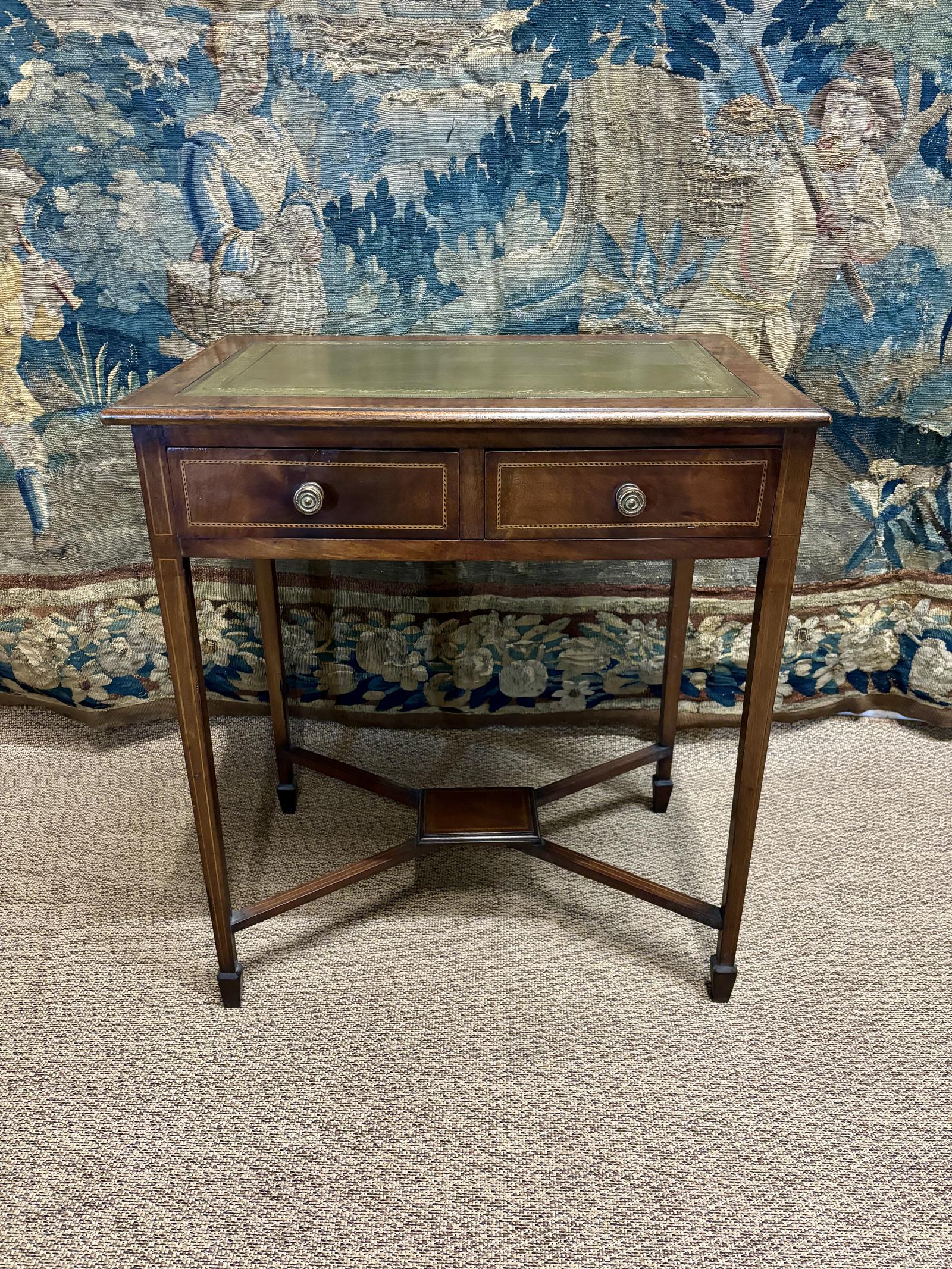 This is a very good quality Georgian antique writing table with green leather top, inlay throughout and two drawers to the front.