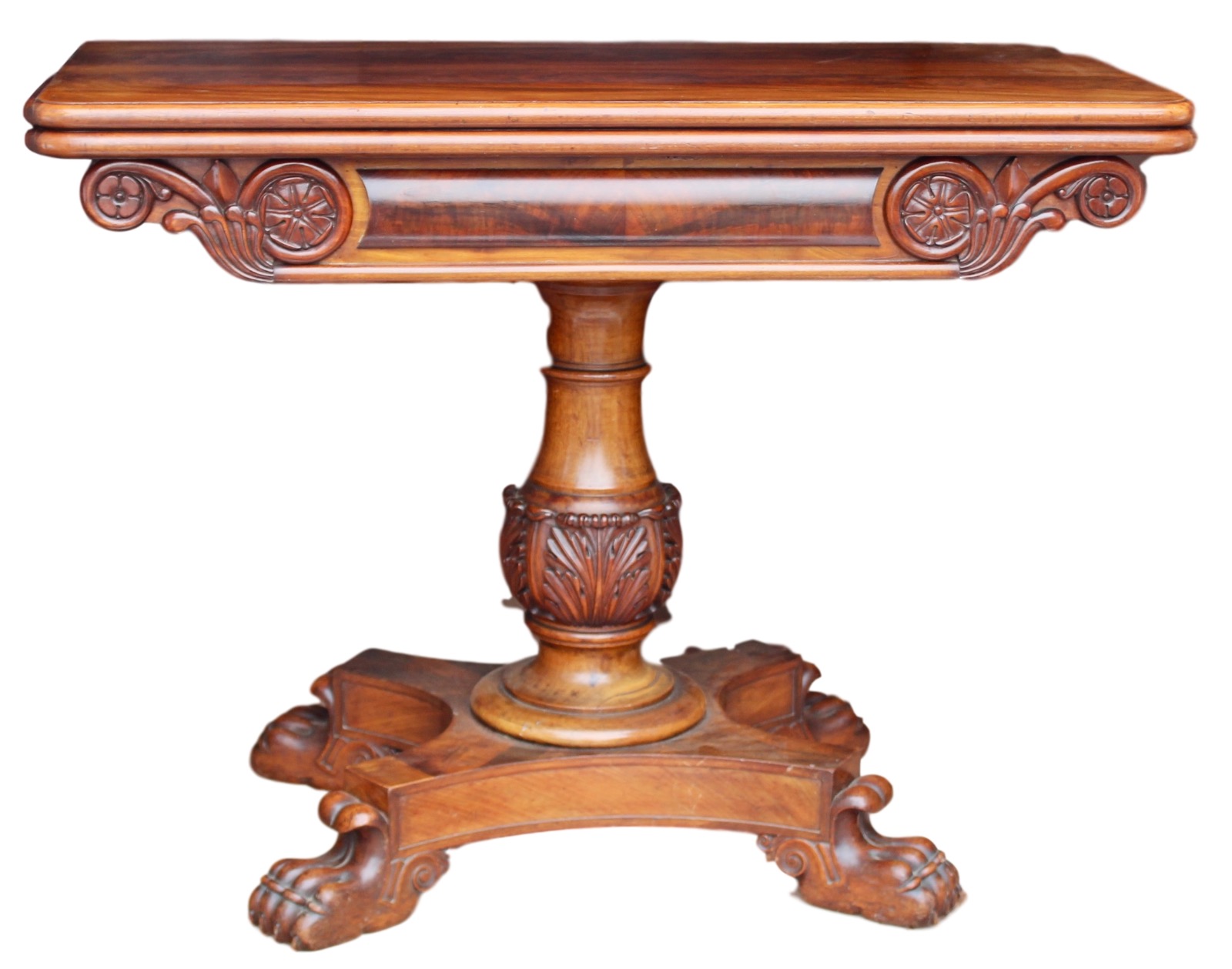 The table stands on four 'hairy paw' feet which support the upper beautifully carved centre support on which stands the fold over top.