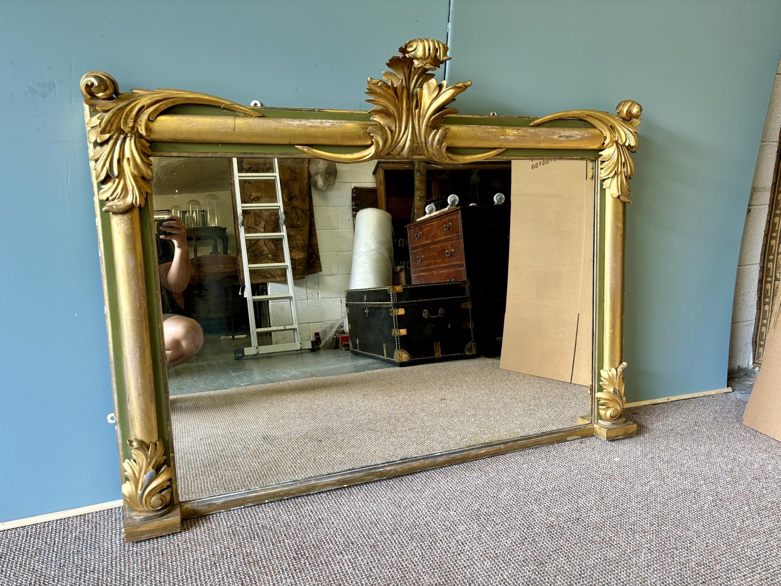 Stunning Large English 19th Century Green & Gilt Overmantle Mirror