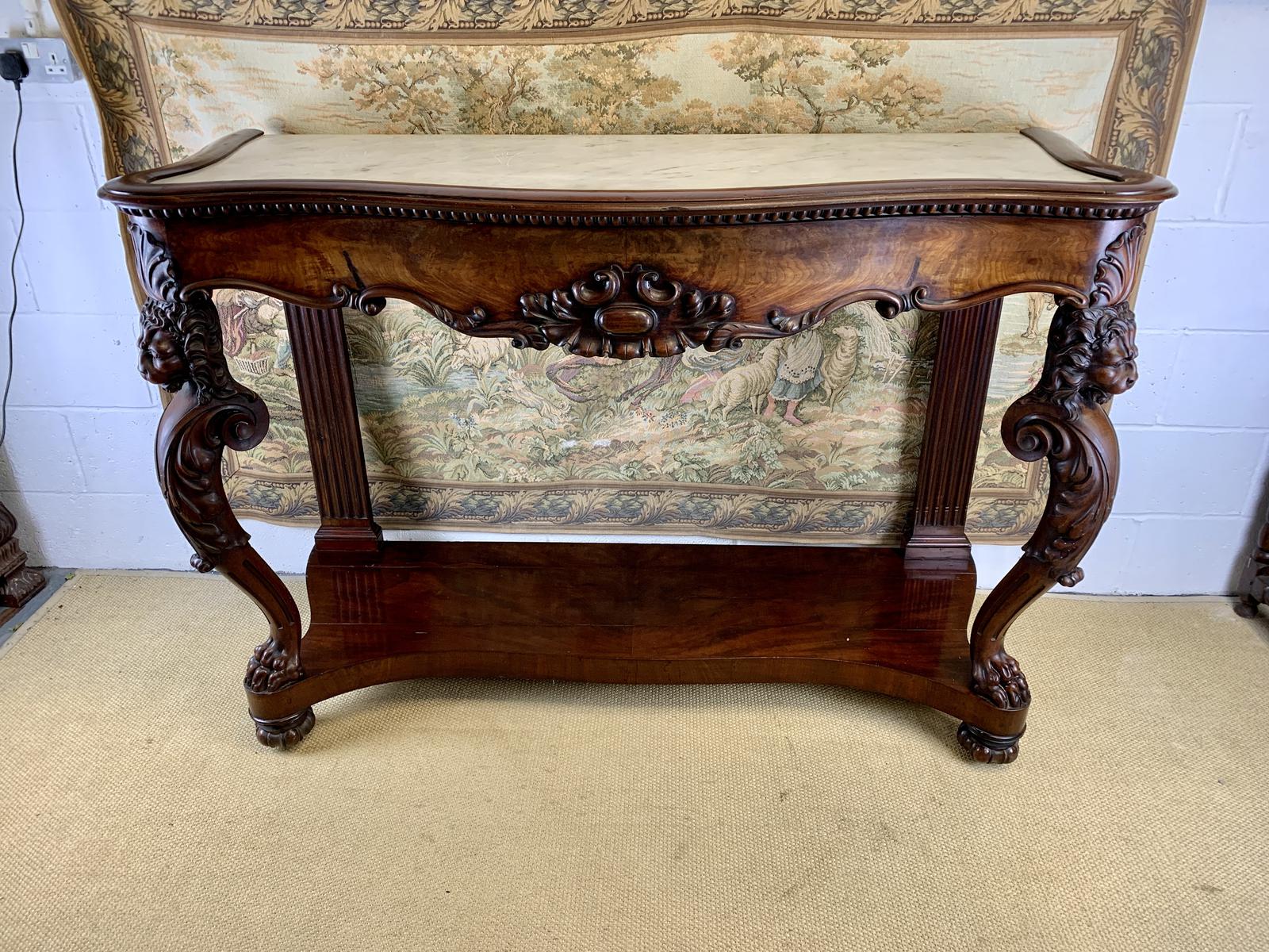A truly exceptional early 19th Century Continental antique walnut carved console table. On a grand scale with detailed carving of lion masks etc throughout. Standing on paw feet with columns to the back.