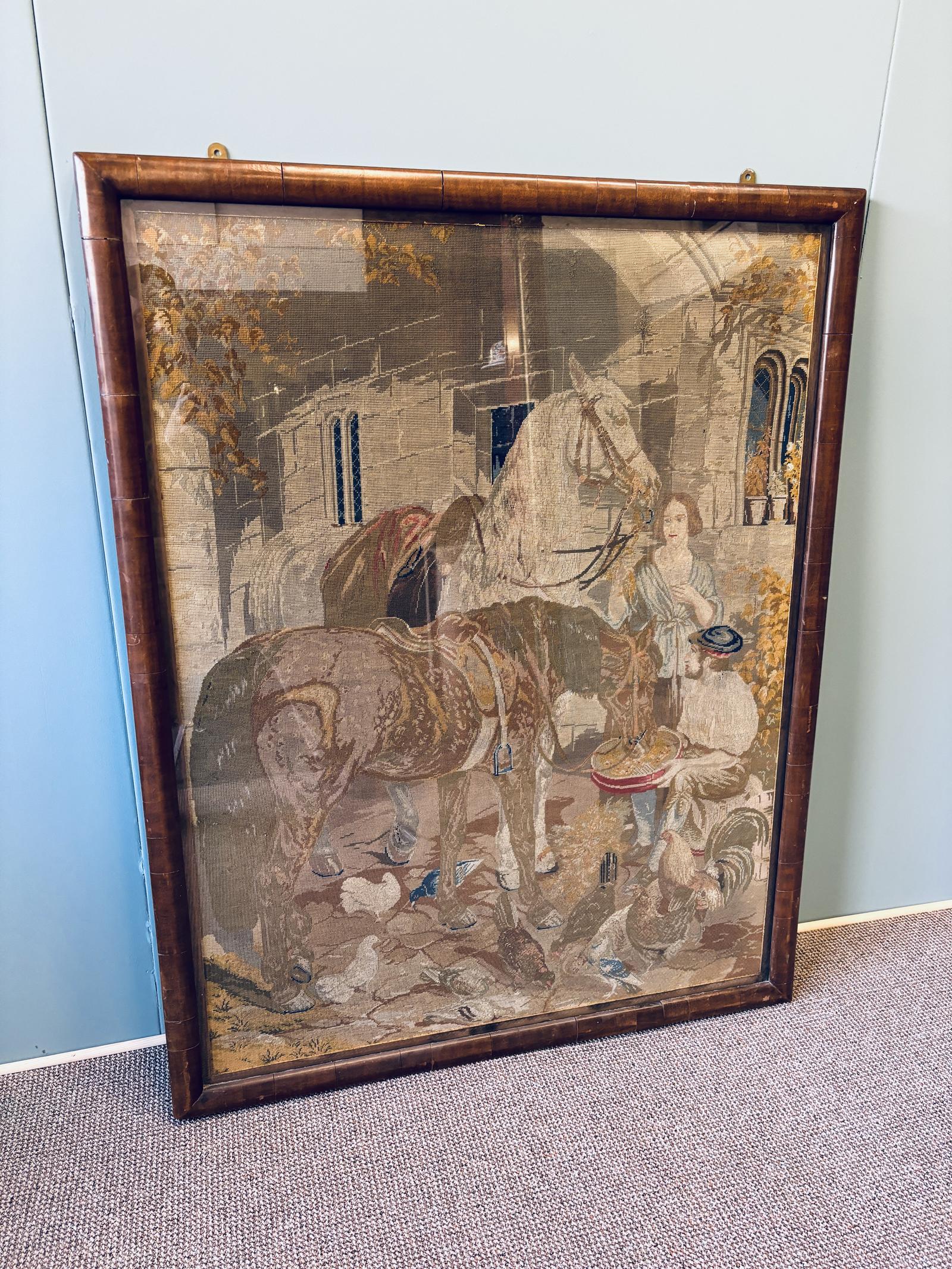 This is a stunning 18th Century antique tapestry fragment. Part of a larger tapestry, showing two horses and a rural scene. It is well framed and set behind glass.
