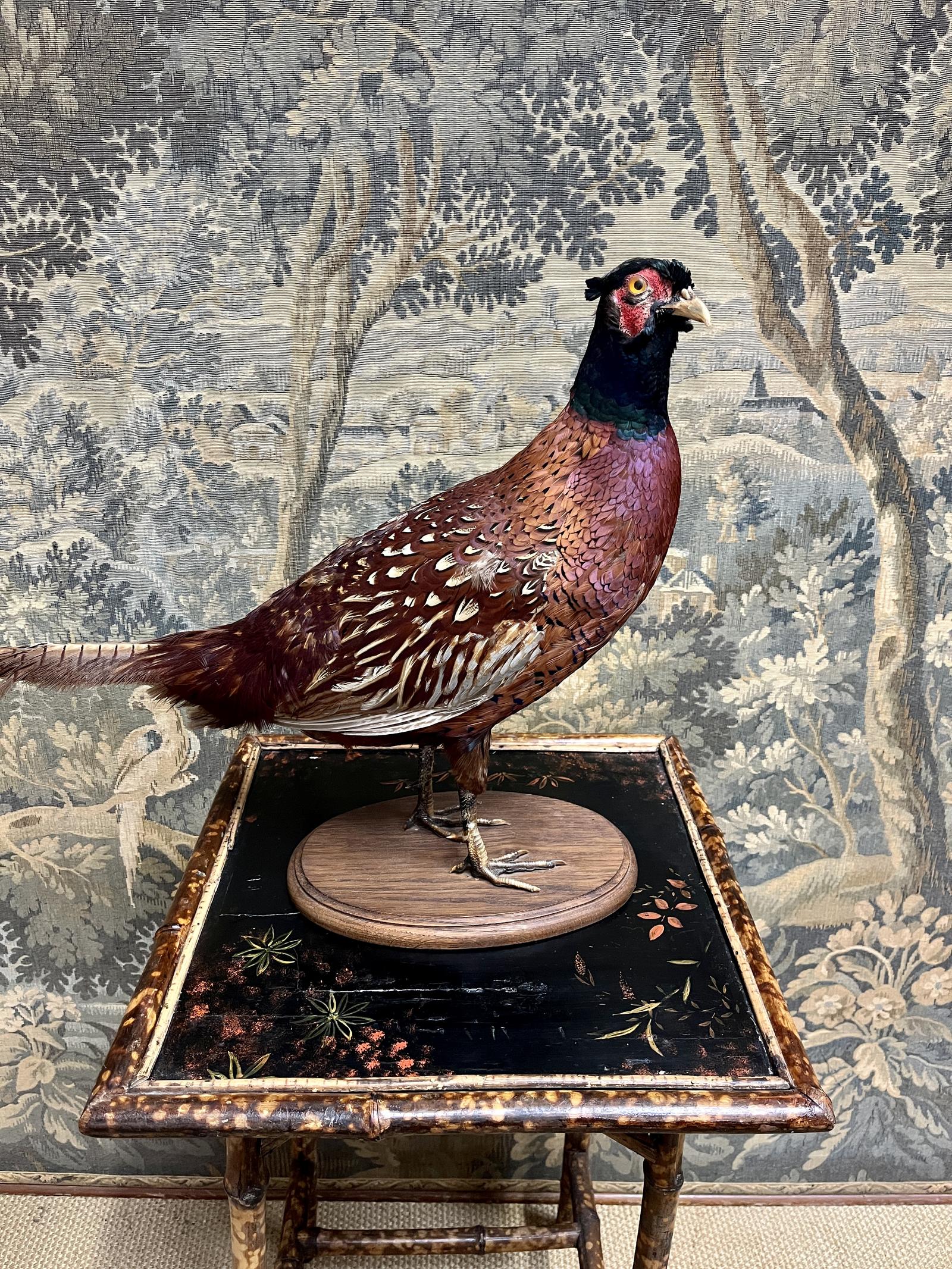 This is a good quality early 20th Century (1920) antique taxidermy Pheasant, standing on wooden base and in overall good condition.