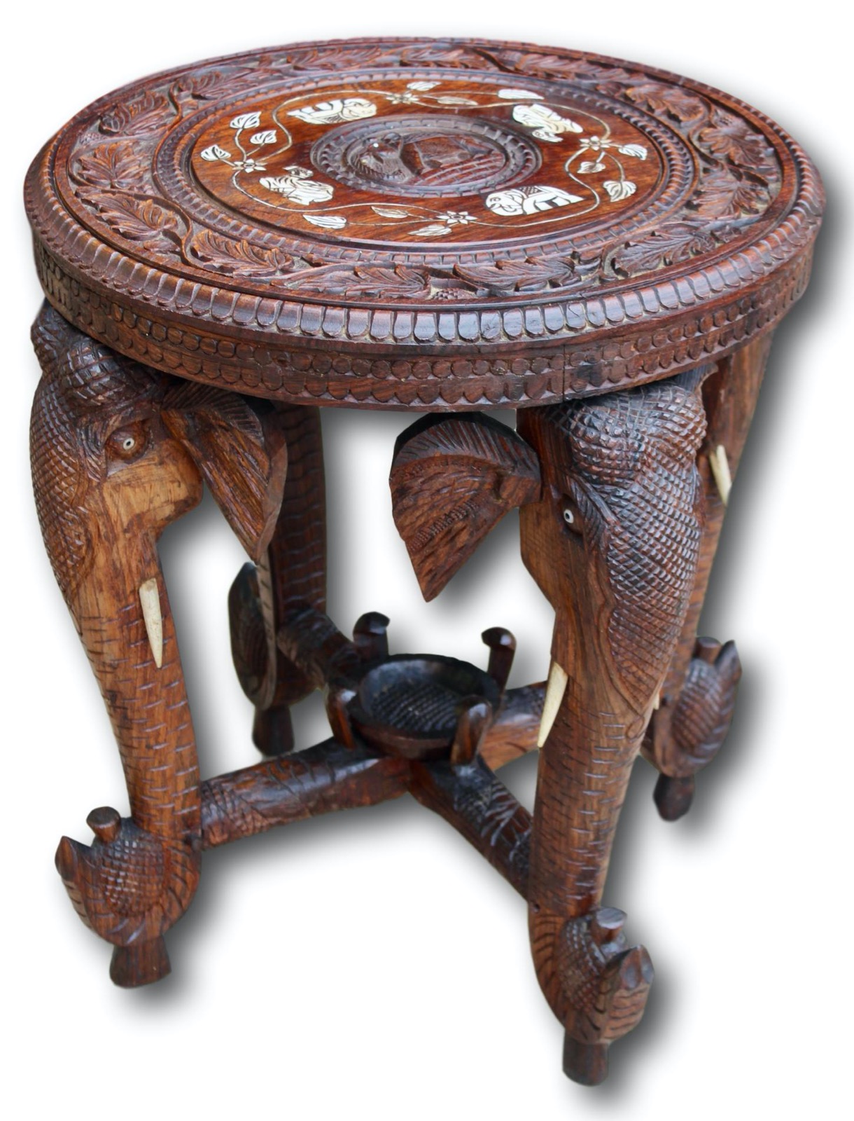 This is a charming turn of the century occasional table carved from hardwood with Elephant decoration throughout. It has a bone inlay to the top.