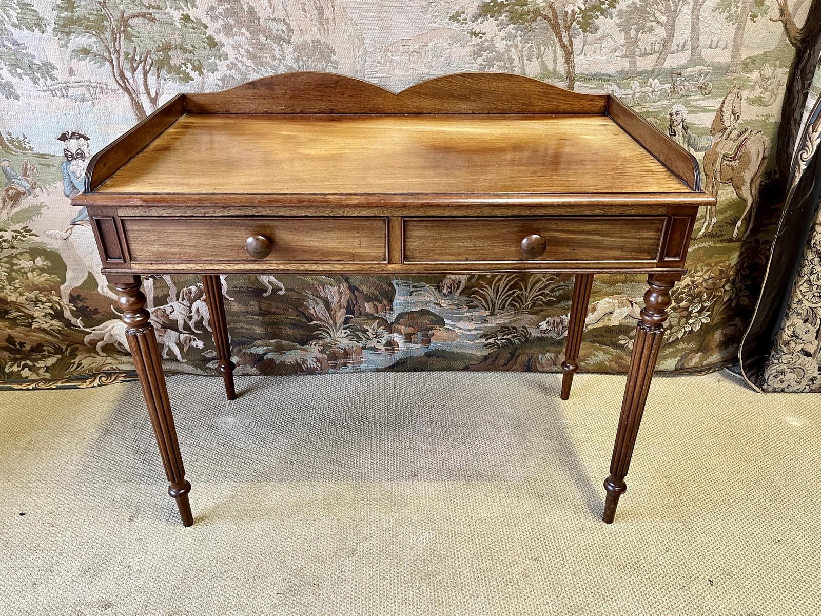 This is a superb English Mahogany two drawer side table that would also work well as a writing table or desk. It is in the manner of Gillows and dating to around 1900.