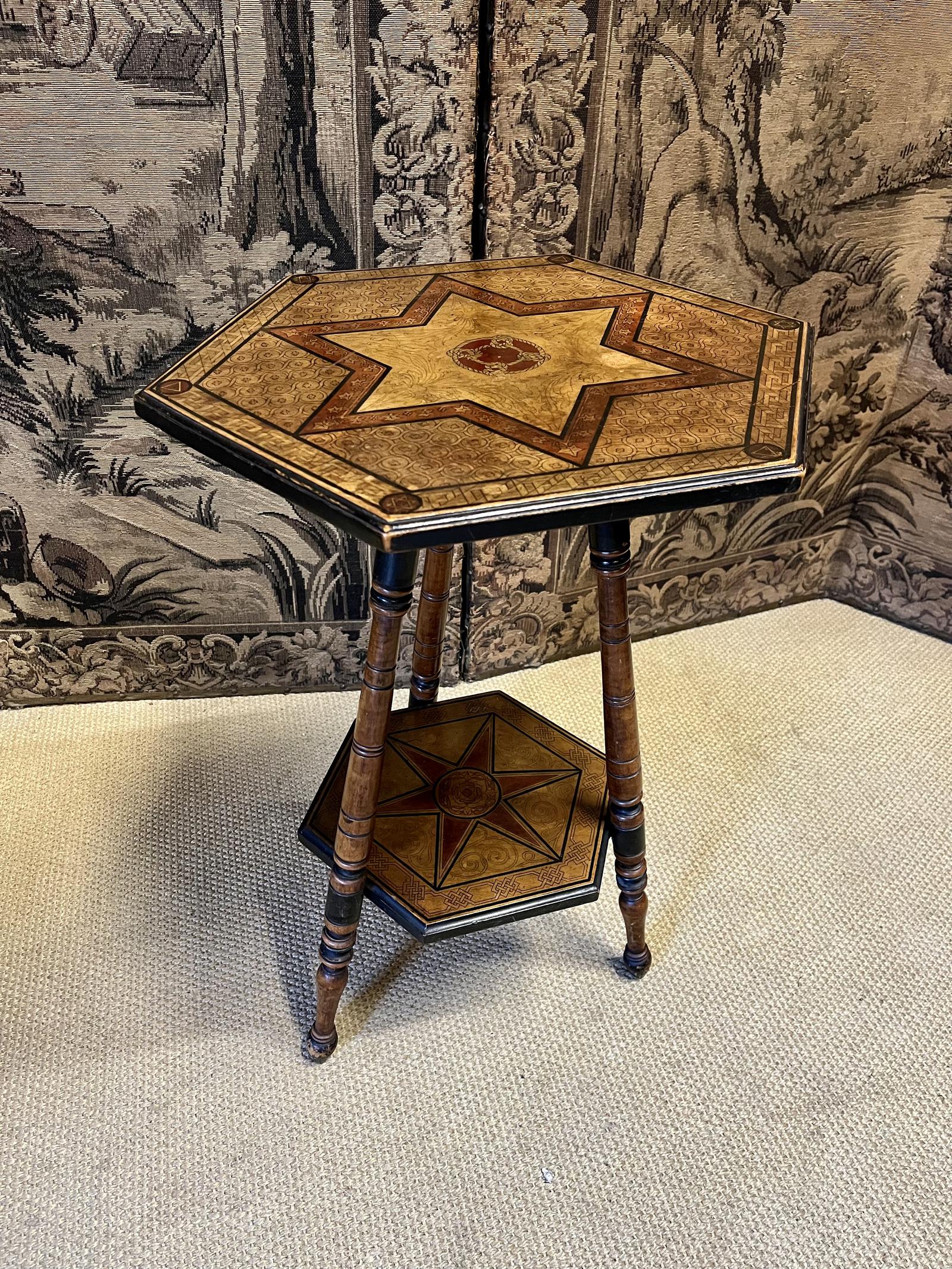 This is a very attractive 19th Century antique inlaid occasional table, on turned legs with ropes, stars and triangles inlaid to the top and base.