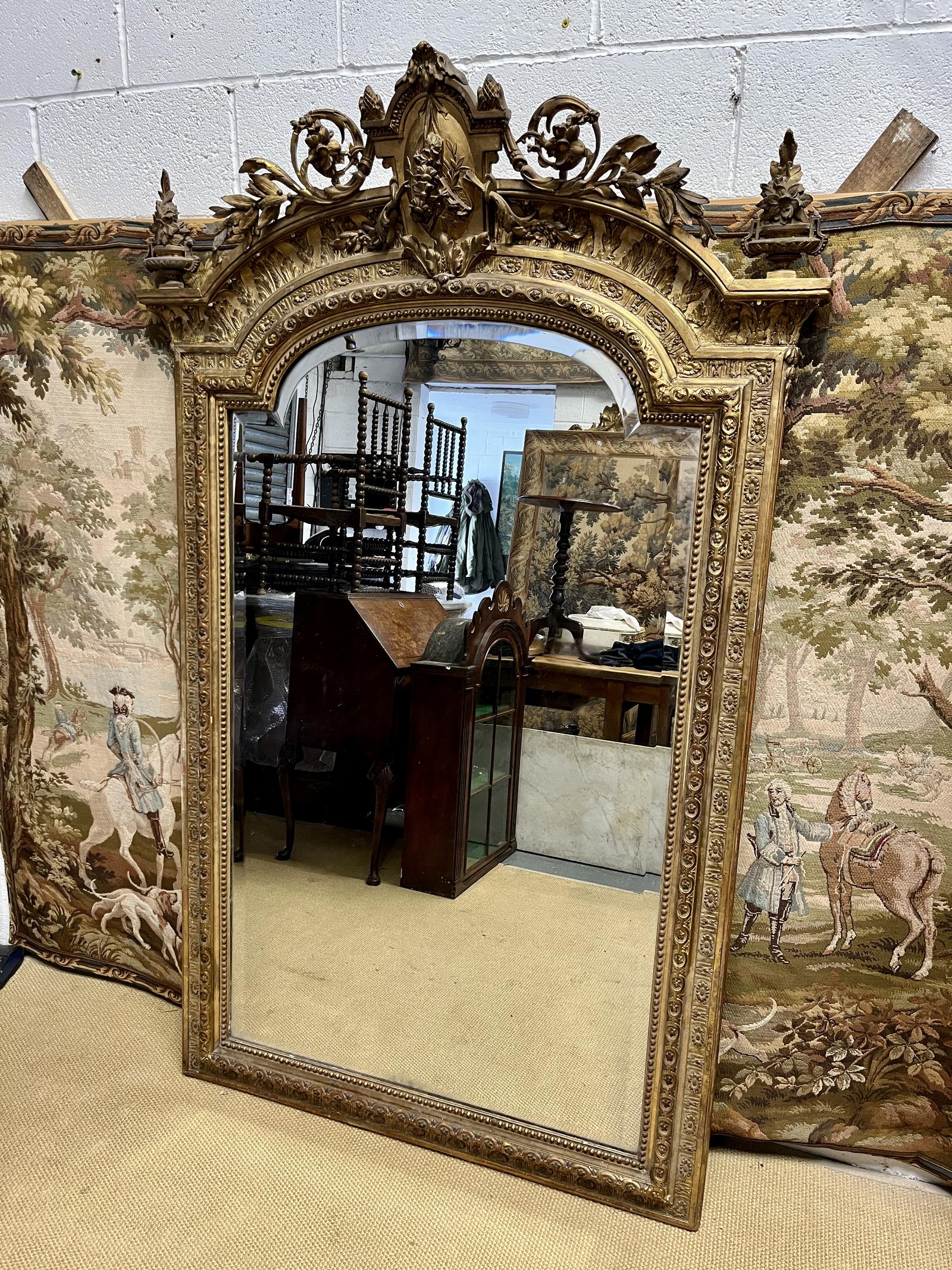 This is an exceptionally large 19th Century (1880) French antique gilt mirror on a grand scale with original bevelled mirror plate. In good condition with some signs of age as shown in photos.