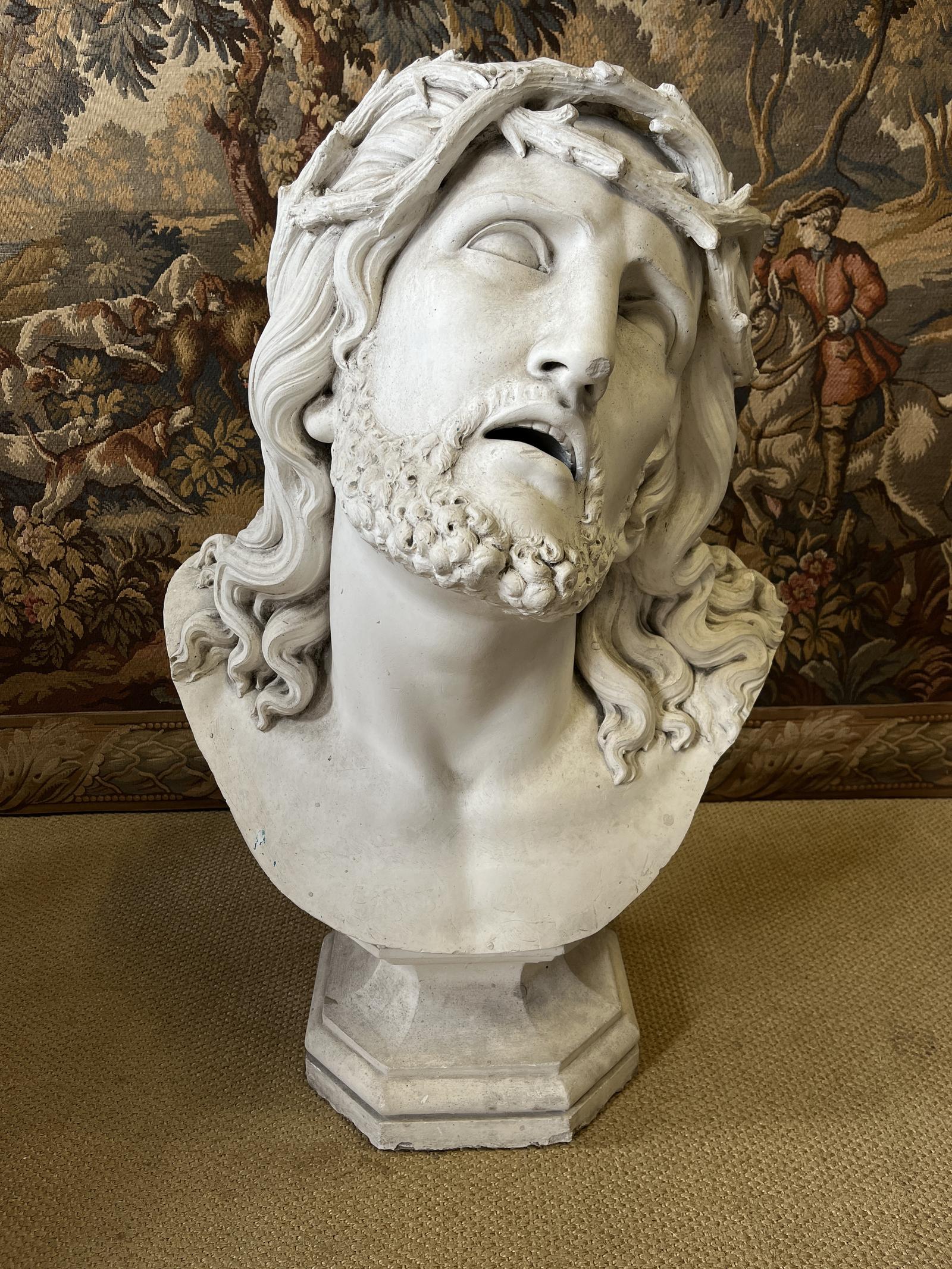 This is a very large plaster bust depicting Jesus Christ. It was made around 1920 and in good condition with minor damage to the end of the nose. On an exceptional scale.