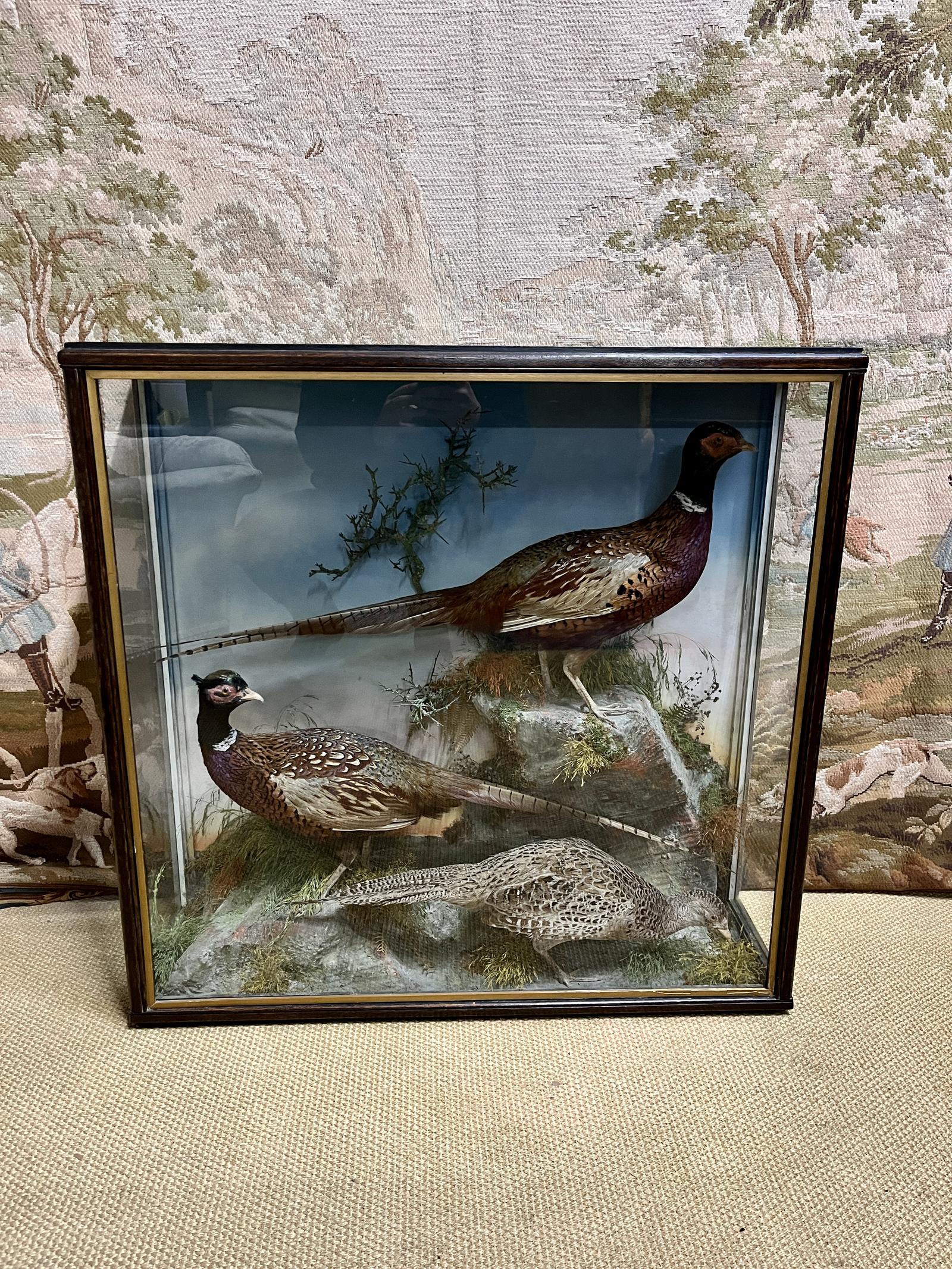 This is a stunning late 19th Century English Victorian (1890) antique cased taxidermy display. Three pheasants in good condition. A superb quality piece.