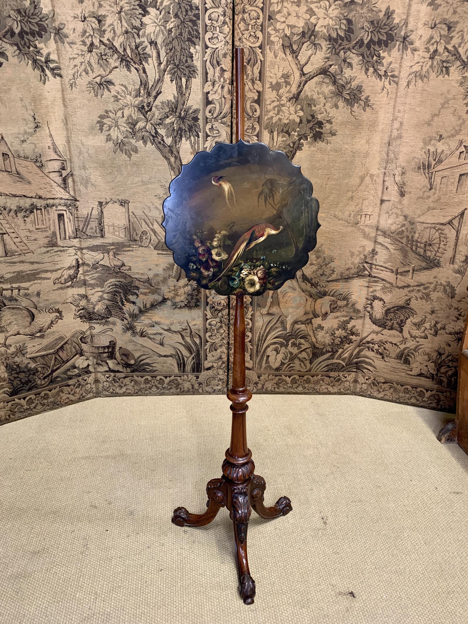 This is a beautiful 19th Century Victorian antique hand painted pole screen. It is on a mahogany stand with brass fittings and indistinctly signed to the back.