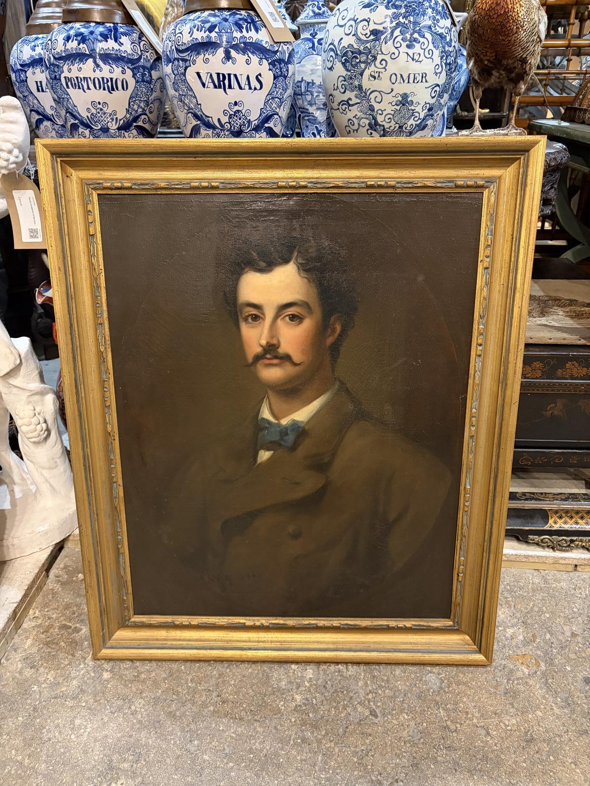 A very good quality oil on canvas portrait of a gentleman with moustache and blue bowtie. Set in to a good quality gilt frame and in very good overall condition.